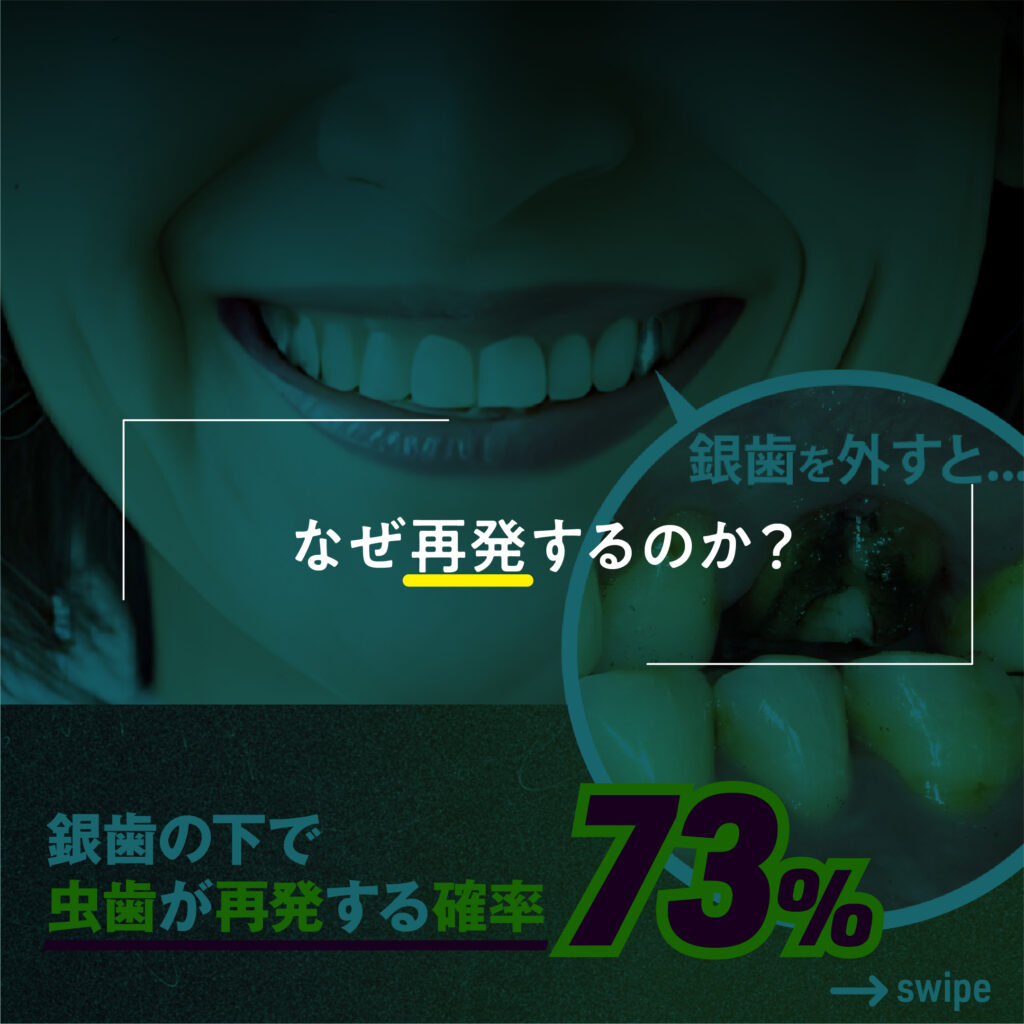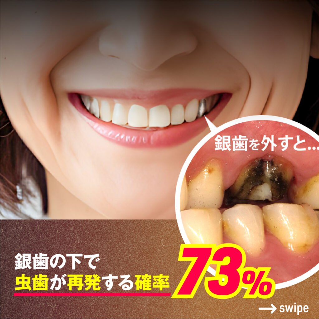 実は、銀歯の下で虫歯が再発している確率は、なんと73%にも上るんです!😱