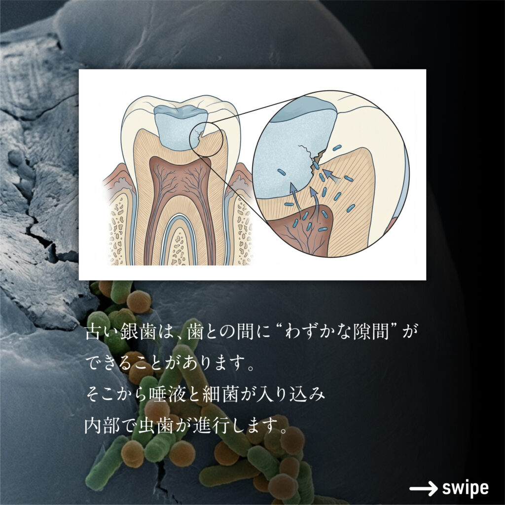 古くなった銀歯と歯の間には、目に見えない隙間やひびが生じます。